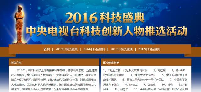 中央電視臺(tái)2016年度科技盛典,是中央電視臺(tái)全力打造的國(guó)家級(jí)年度科技盛宴,全面展現(xiàn)2016年度中國(guó)科技重大成就,表彰具有國(guó)際影響力和突出表現(xiàn)的科技創(chuàng)新人才和團(tuán)隊(duì),打造中國(guó)科技界的“奧斯卡”。此次評(píng)選由央視、中國(guó)科學(xué)院、科學(xué)技術(shù)部、教育部、中國(guó)工程院、中國(guó)科學(xué)技術(shù)協(xié)會(huì)、國(guó)家自然科學(xué)基金會(huì)、國(guó)家國(guó)防科技工業(yè)局等單位主辦。