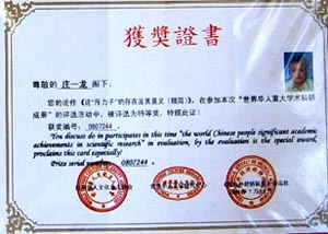 尊敬的莊一龍同志:鑒于你您在學術領域中取得的學術成就和做出的學術貢獻,以及在世界華人華僑群體中產生的巨大反響,在本次國際交流評選活動中,您被評為被評為“最具有影響力的學術華人”,并授予您“環(huán)球時代杰出人物特殊貢獻獎! 世界文獻出版社,世界優(yōu)秀華人成就交流協(xié)會,世界學術成果研究院。2010年10月。